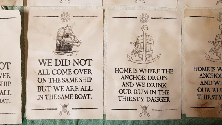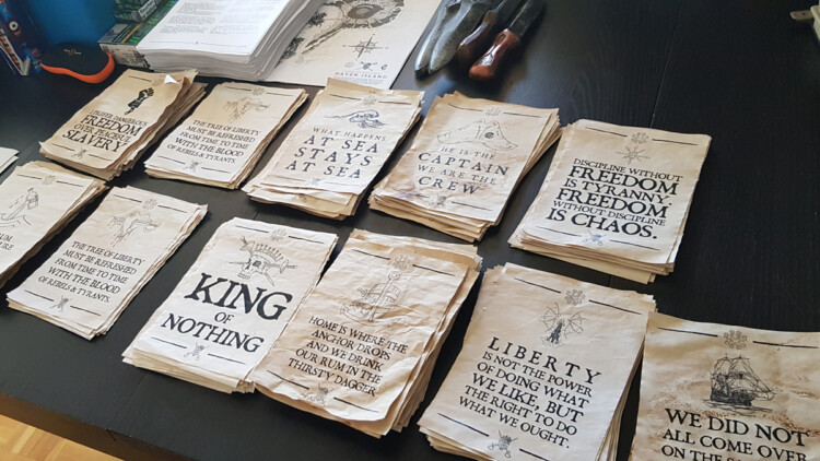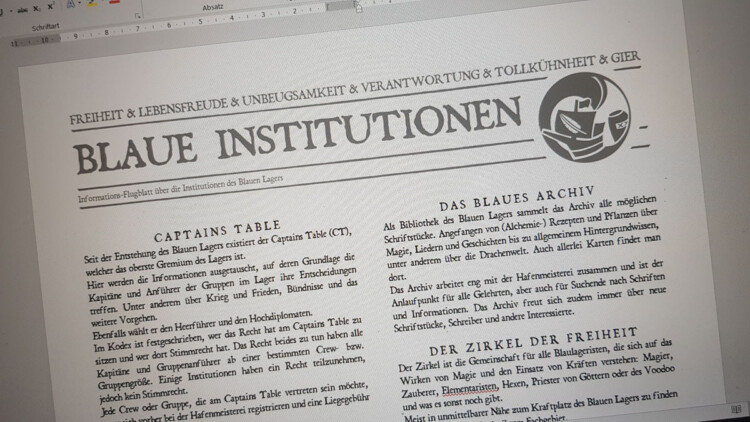 Die Flugblätter und das Abbild des Meeresgottes waren solche Sachen. Ebenso das neue Etikett für den Portwein, für das ich ja erst beim Zeit der Legenden Bedarf an einer Neuerung erkannt habe. Dazu zählt auch ein IT-Flugblatt über die Institutionen des Blauen Lagers in deutscher und englischer Sprache, um diese Infos vor allem an neuen Crews im Lager zu verteilen.