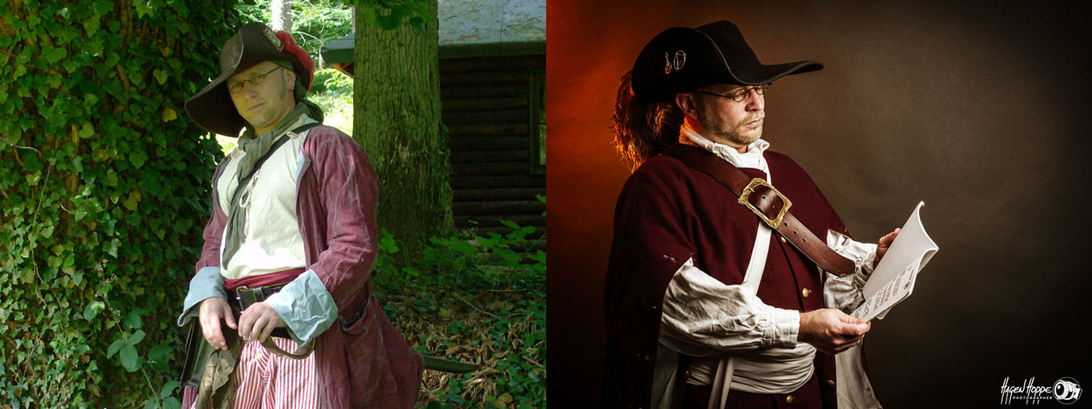 Es ist aber auch festzustellen, dass Askir seit 2015, in seinem zweiten Jahr als Diplomat des Blauen Lagers auf dem Drachenfest, immer dunkler geworden ist. Vom Streuner und Glücksritter mit Seefahrerhintergrund wurde er zum Haupteigner einer Handelscompagnie und damit wohlhabenden sowie ehrbaren Händler. Eine Entwicklung, die man auf den obigen Fotos gut erkennen kann. Dann begann er sich im Blauen Lager zu engagieren, kam öfter in Kontakt mit Piraten und in seiner Moral näherte er sich wieder dem Askir an, der er am Beginn seiner Reise war. Waren meine Westen am Anfang meiner blauen Phase 2015 noch in einem hellen Blauton gehalten, wurden sie 2020 schon Dunkelblau. Fünf weitere Jahre später ist es an der Zeit noch etwas dunkler zu werden und Rot wird als Kontrastfarbe das bisherige Naturweiß ersetzen.